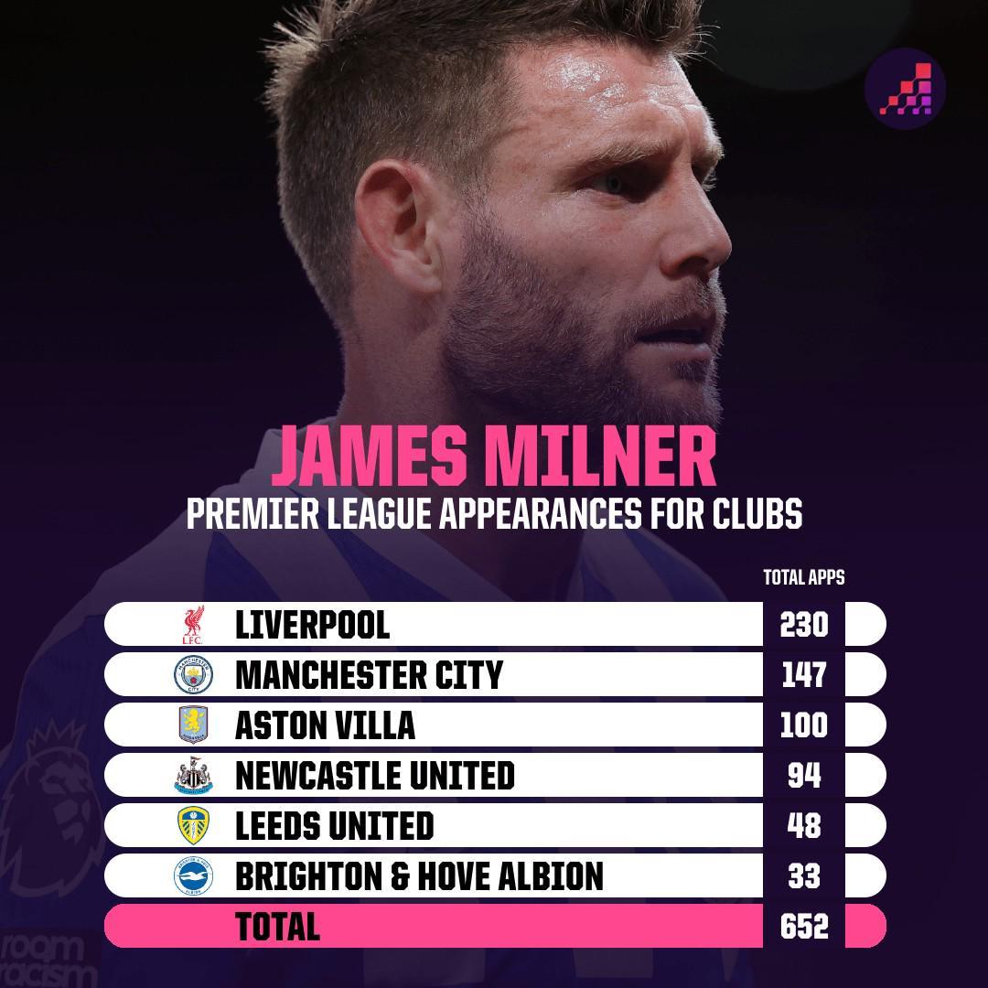 据统计,米尔纳已经在英超出场652次,如果周日他出战水晶宫,这位40岁老将将追平由巴里保持的英超历史出场纪录(653场)。